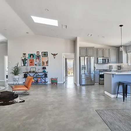 Die 2-Zimmer- Eclectic Joshua Tree verfügt über eine sonnige Terrasse mit Blick auf den Garten und ist 58 Autominuten vom Flughafen Palm Springs entfernt gelegen.